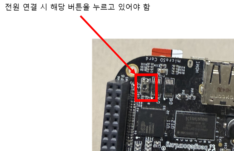 그리고 Beaglebone은 SDcard외 eMMC라는 저장장치가 기본적으로 탑재되어 있습니다. 그래서 기본적으로는 SD 카드로 부팅하지 않고 eMMC를 통해 부팅을 하게 되어있습니다. 그러므로 SD 카드로 부팅하기 위한 버튼이 존재합니다. 해당 버튼을 전원 연결시 누르고 있어야 SDcard로 부팅할 수 있습니다.