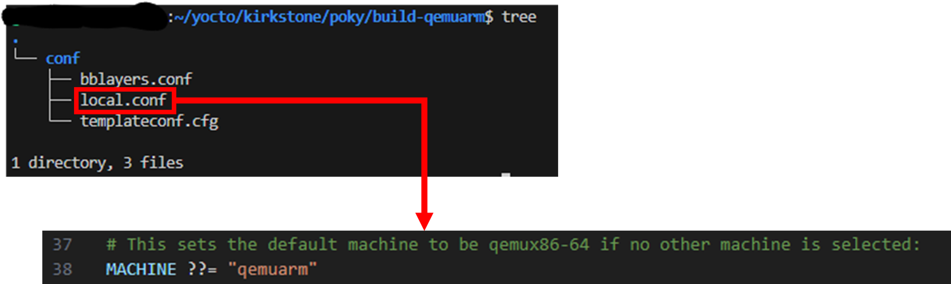 Local.conf 내 MACHINE 변수를 "qemuarm"으로 변경합니다.