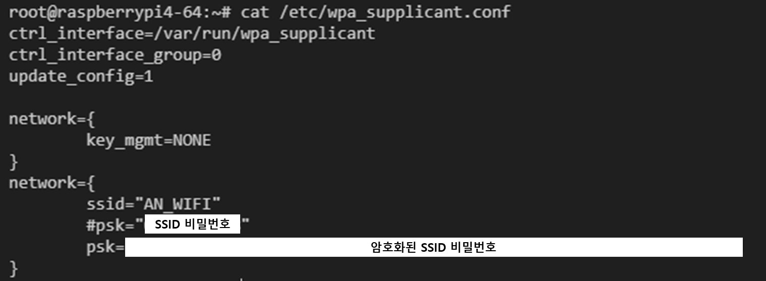 wpa_passphrase <SSID 이름> <SSID 비밀번호> >> /etc/wpa_supplicant.conf