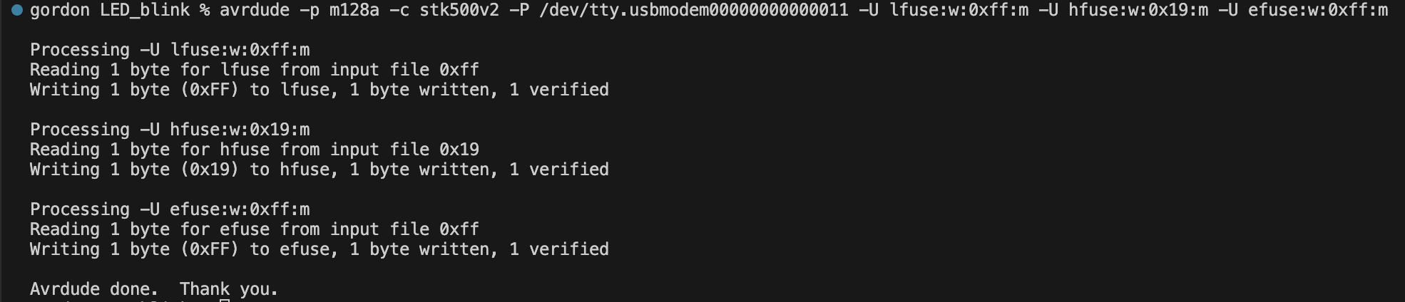avrdude -p m128a -c stk500v2 -P /dev/tty.usbmodem00000000000011 -U lfuse:w:0xff:m -U hfuse:w:0x19:m -U efuse:w:0xff:m