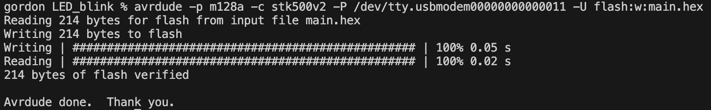 avrdude -p m128a -c stk500v2 -P /dev/tty.usbmodem00000000000011 -U flash:w:main.hex