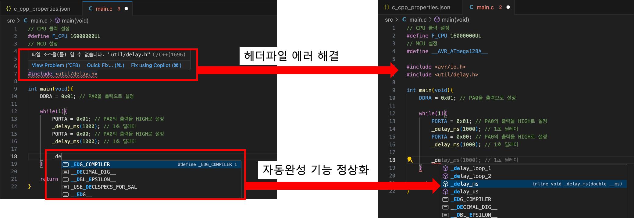 이제 헤더파일의 에러가 사라지고 자동완성 기능도 문제 없이 동작합니다.