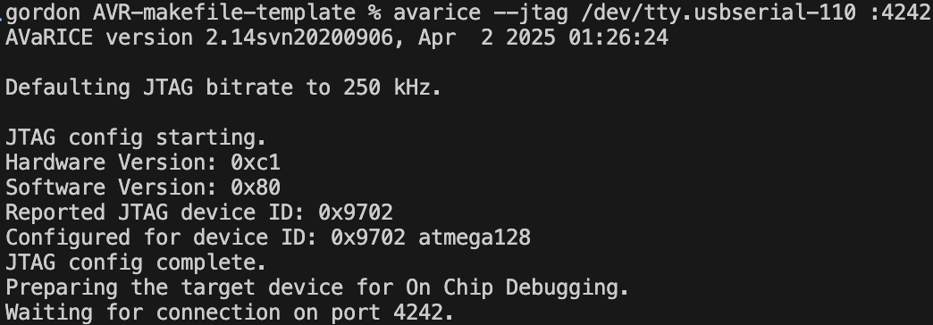 이제 JTAG로 연결된 MCU에 접근하기 위해 avarice를 실행합니다.