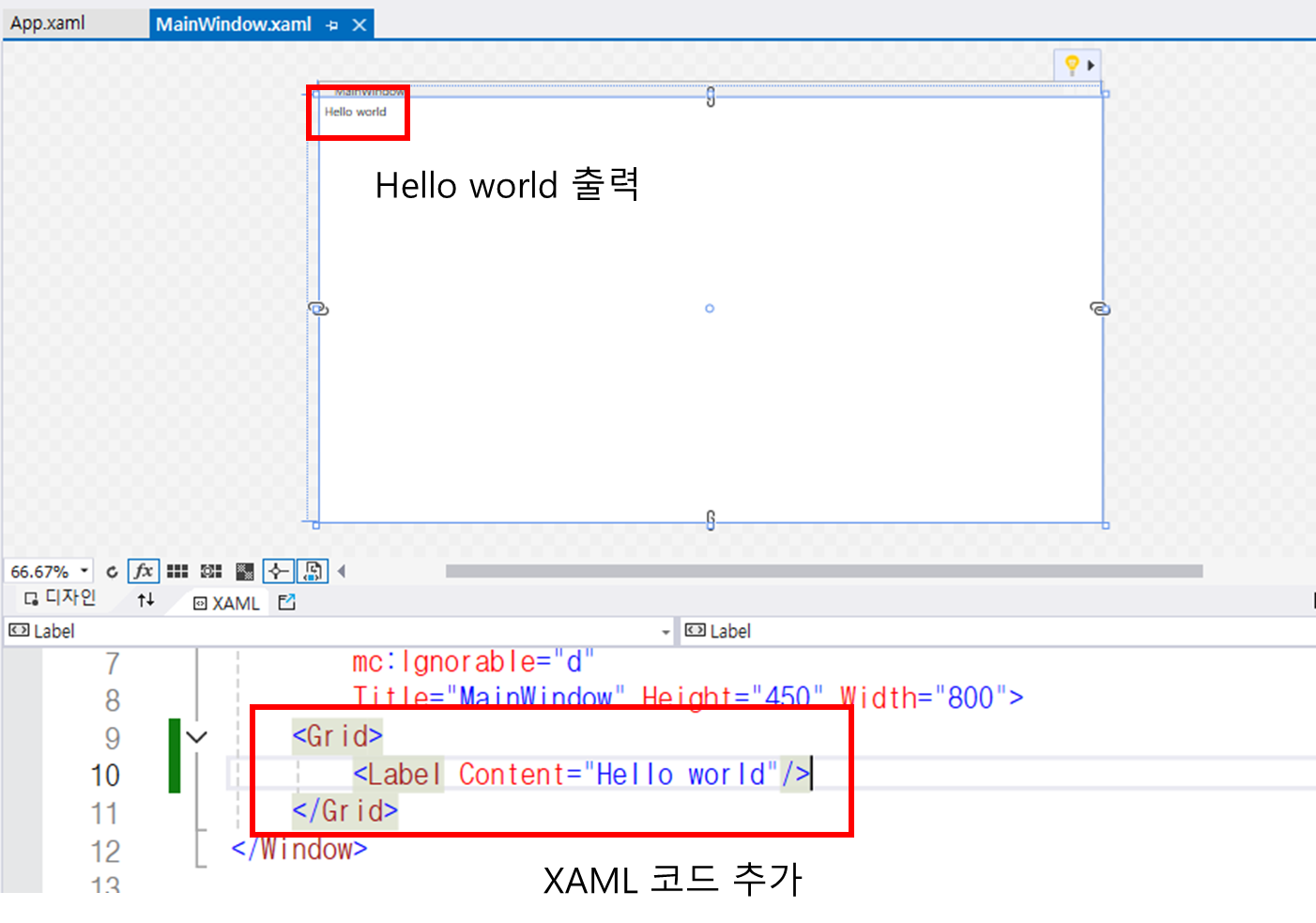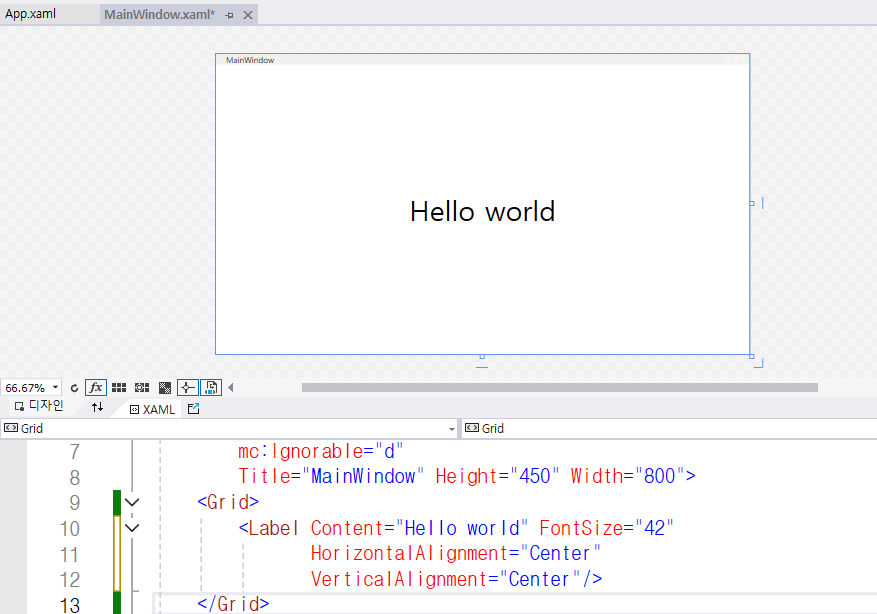 WPF에서 좀더 구체적인 UI 또는 반응형 UI을 개발하기 위해서는 XAML으로 UI를 개발할수 밖에 없습니다. 가장 기본적인 Hello World를 Label로 출력해 보겠습니다. 지금 당장은 이해가 안가는 부분이 많겠지만 한번 천천히 따라하면서 설명하도록 하겠습니다.
