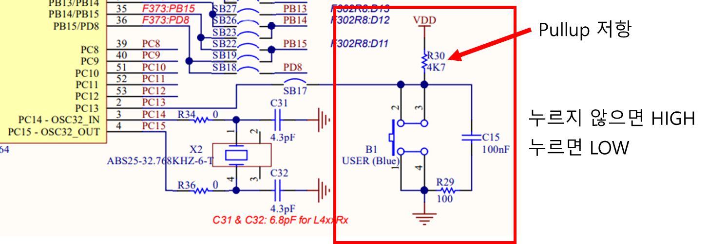 버튼을 누르지 않은 상태에서는 PC13에 풀업저항을 통해서 3.3V가 입력이 되어 GPIO_PIN_SET즉 High가 입력됩니다.