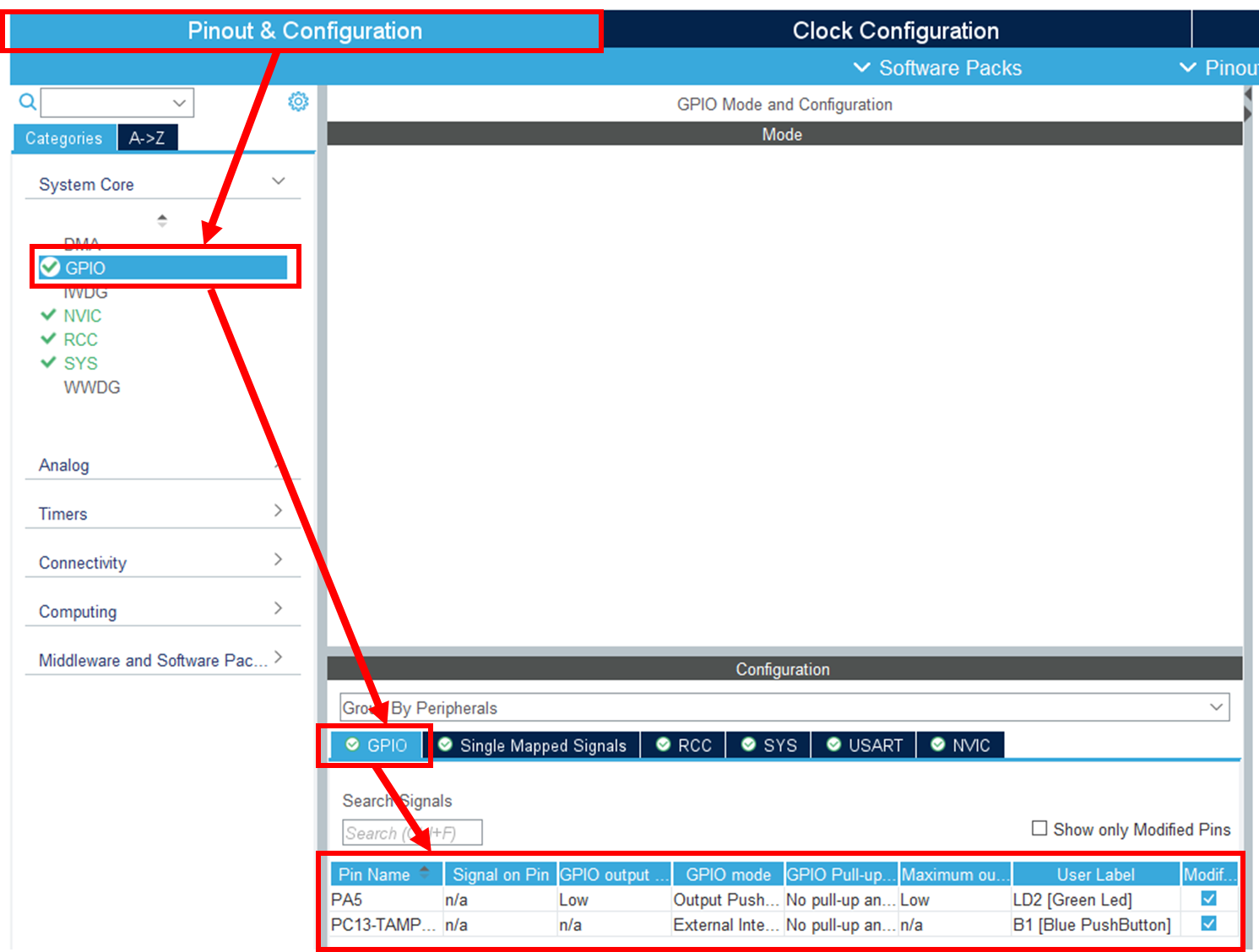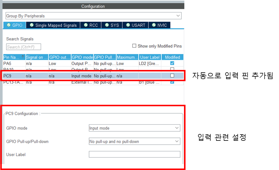 PA5는 Green Led, PC13은 Blue PushButton이라고 Label도 달려있습니다.