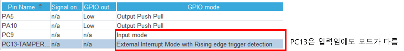 PC13도 분명히 입력인데도 불구하고 GPIO 모드가 Input mode가 아닙니다.