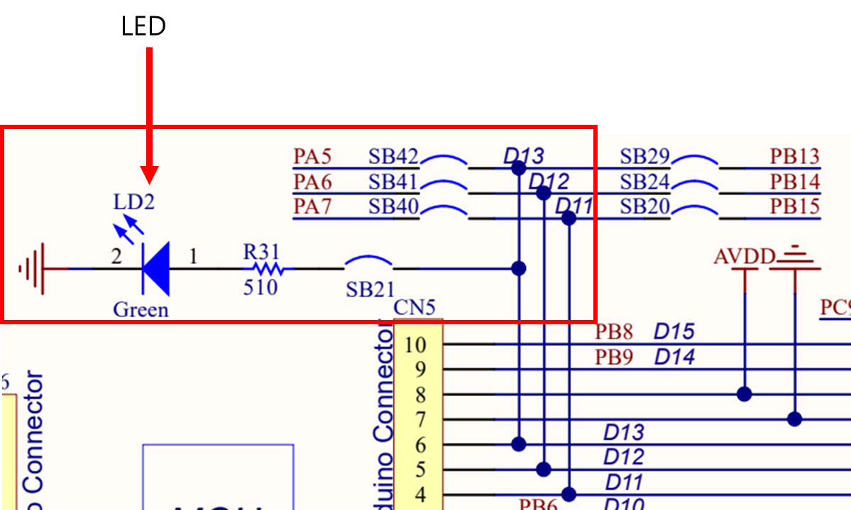 이때 LED는 PA5가 GPIO_PIN_SET이면 3.3V가 출력되어 LED가 켜지게 되고, PA5가 GPIO_PIN_RESET이면 0V가 출력되어 LED가 꺼지게 됩니다.