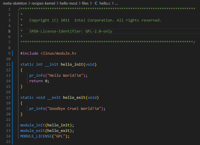 여기서 files 폴더 내 hello.c의 내용을 확인해보면 가장 기본적인 모듈 구조를 미리 작성해두었습니다.