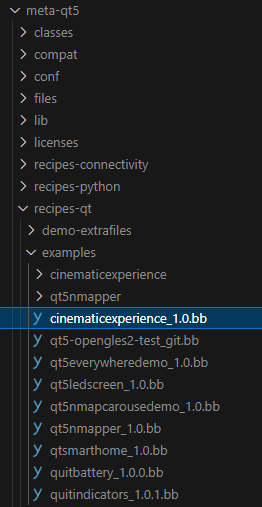 qt5의 예제는 "meta-qt5/recipes-qt/example" 폴더에 존재합니다. 이번에는 cinematicexperience 예제를 추가해보도록 하겠습니다.
