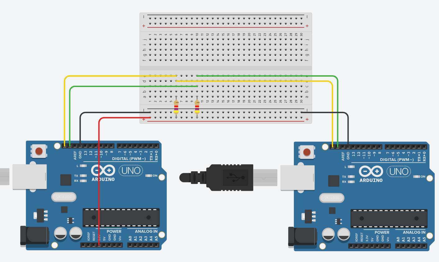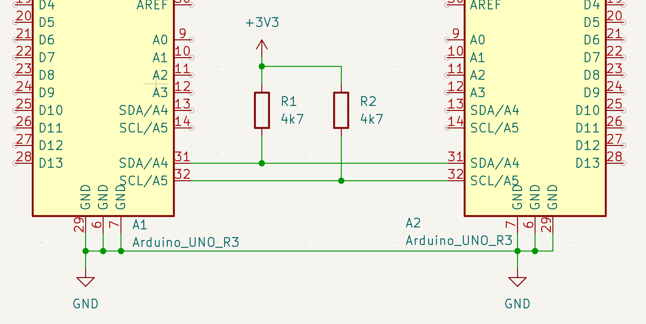 주의 할 점은 풀업 (Pull-up) 저항으로 4.7k옴을 사용하는 것과 두 아두이노 보드의 그라운드(GND)을 서로 연결해주어야 합니다. 두 보드가 Arduino Uno R3를 사용한다면 풀업 저항은 필수가 아닙니다. 하지만, Arduino Uno R4 를 사용한다면 반드시 풀업저항을 사용해야 합니다.
