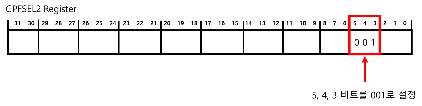 GPFSEL2 레지스터는 20~29 Pin에 대해서 기능 설정을 하는 레지스터입니다. 우리는 21번 핀을 Output으로 설정해야하므로 해당 레지스터의 5:3 Bit를 001로 설정해야합니다.