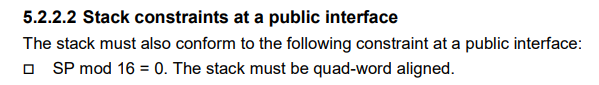 ARMv8-a은 ARM 64bit 을 기반으로 하는 아키텍쳐 입니다. 그렇기에 해당 문서를 확인 해보면 스택의 주소가 16Byte(Quad-word) 배수로 설정해야한다고 적혀 있습니다.