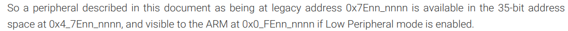 위 내용에 따르면 UART0의 Base 주소는 0x7E20 1000 로 보이지만 실제는 그렇지 않습니다. 해당 주소는 "Legacy Master view" 에 해당하는 주소이며 실제로는 "ARM view"에 해당하는 주소를 사용해야합니다.