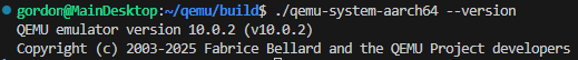 만약 10.0.2 버전으로 나오지 않는다면 기존 apt로 설치한 qemu를 실행하고 있는 것일 수 있습니다. build 폴더에 있는 qemu로 실행해보세요.