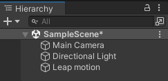 Leap motion이라는 새로운 Empty 오브젝트를 추가하고 그안에 Leap motion을 사용하기 위한 Prefab들을 추가하도록 하겠습니다.