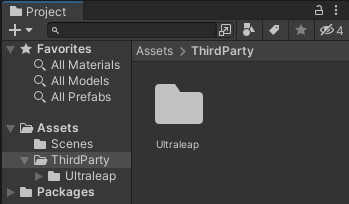 제대로 추가하였다면 다음과 같이 Asset->ThirdParty 폴더 안에 Ultraleap 폴더가 생긴 것을 확인 할 수 있습니다.