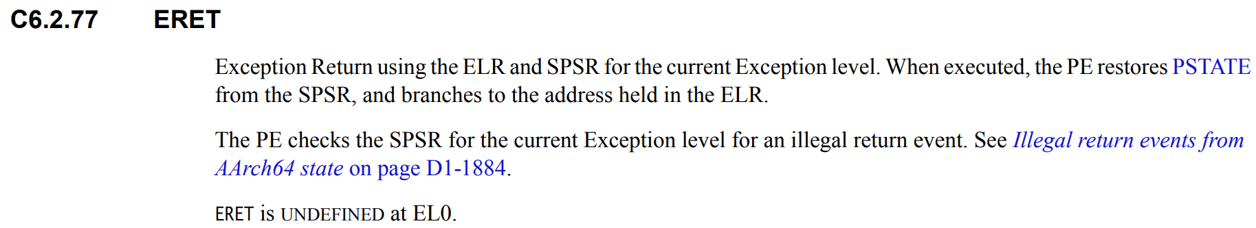 이제 실질적으로 모드를 전환하기 위해서는 Exception RETurn를 발생해야 합니다. 다행스럽게도 ARMv8에서는 해당 Exception를 발생시키는 명령어를 제공합니다.