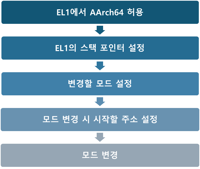이번 포스트에서는 EL2에서 EL1으로 모드를 변경하는 경우에 대해서만 다루도록 하겠습니다. 현재 모드와 바꾸고 싶은 모드에 따라서 접근해야하는 레지스터가 다르고, 또 하위 EL(EL0)에서 상위 EL(EL1,2,3) 로 이동하는 방법 또한 다르기에 굳이 여기에 모든 방법을 다루지는 않겠습니다.