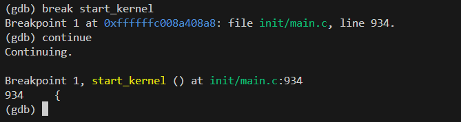 먼저 실행한 후 디버깅 심볼이 저장되어 있는 vmlinux 부터 로딩합니다. 해당 파일을 로딩하지 않는다면 디버깅 심볼이 없어 BreakPoint을 제대로 설정할 수 없거나 C언어가 아닌 어셈블리언어가 보일 수 있습니다. 그다음 현재 멈추어 있는 Qemu에 연결합니다. 그리고 마지막으로 디버깅할 함수에 브레이크 포인트를 설정합니다.