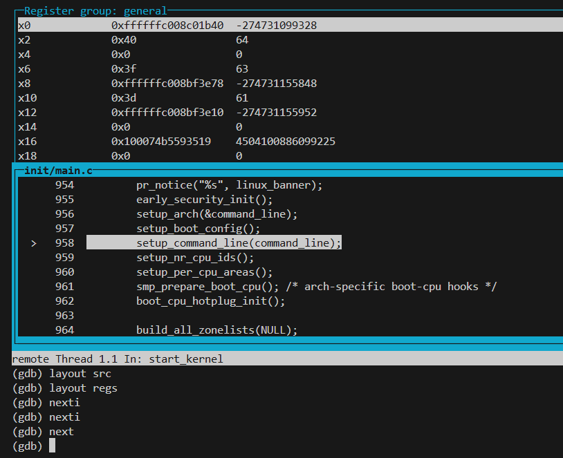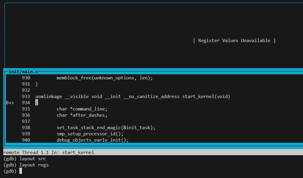 이제 디버깅 하기 쉽도록 layout을 설정합니다. (만약 layout 명령어가 없다면 buildroot에서 tui 설정을 해야합니다.)