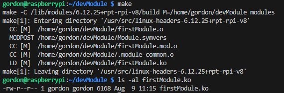 firstModule.ko가 생성되었다는 것은 정상적으로 모듈을 빌드하였다는 것입니다.