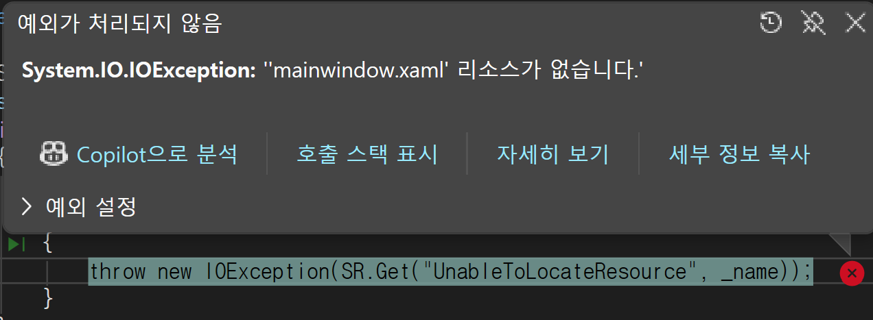 위 오류가 발생한 이유는 MainWindow.xaml의 위치가 변경되어 MainWindow.xaml을 찾지 못하여 발생하는 에러입니다. 위 에러를 해결하기 위해서는 App.xaml 파일내 StartupUri 속성을 새로 변경한 위치로 변경해야합니다.