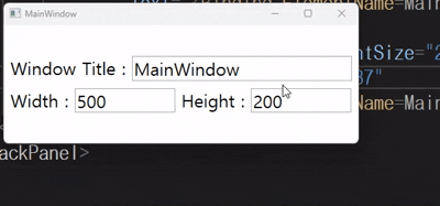 위 코드는 MainView의 Width를 Text 속성과 Binding한다는 의미입니다. TextBox의 값을 변경하면 실제로 Window 크기가 변경되는 것을 확인 할 수 있습니다. 또한 TextBox의 Text는 String의 문자열데이터이지만 자동적으로 int형의 Width 속성을 수정 할 수 있음을 확인 할 수 있습니다.