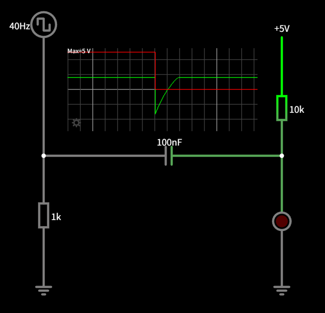 위 회로에서 모이듯 빨강이 5V에서 0V로 떨어지면 초록도 같이 5V가 강하됩니다. 하지만 캐패시터를 통해 원래 전압으로 서서히 복귀합니다.
