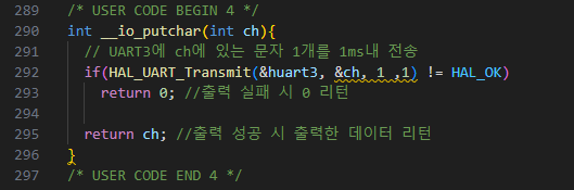 위에서 확인 할 수 있듯이, __io_putchar() 함수가 선언은 되어 있지만 동작을 위한 몸체가 없는 것을 확인할 수 있다. 또한 함수 선언에 extern이 붙어 있어 다른 파일에서 해당 함수를 작성 할 수 있도록 한 것을 확인 할 수 있다. 그러므로 해당 함수를 main.c 파일에서 작성 해 줄 것이다.