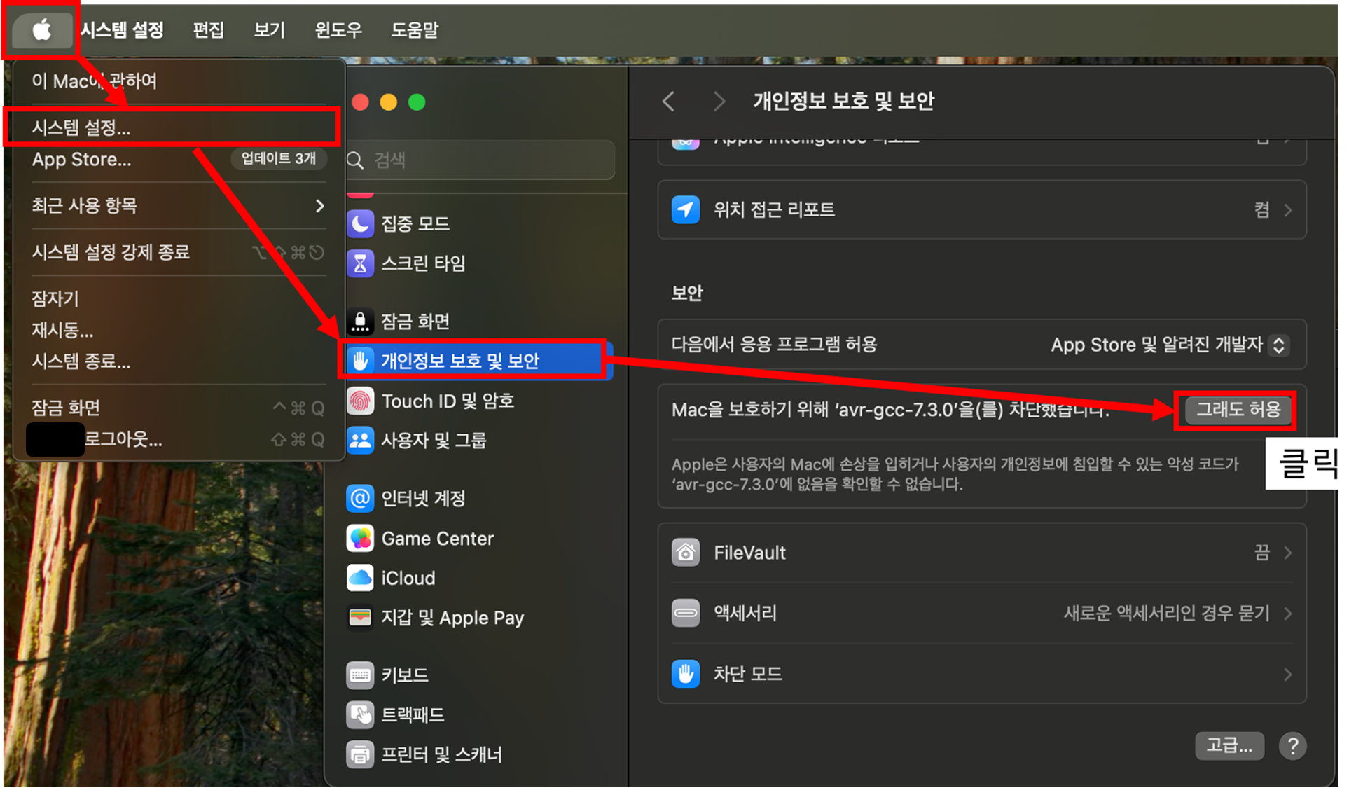 이제 다시 터미널로 다시 "avr-gcc"를 실행하고 비밀번호 입력 하여 사용자 인증을 통해 프로그램을 허용해주면 앞으로 문제 없이 사용가능합니다.