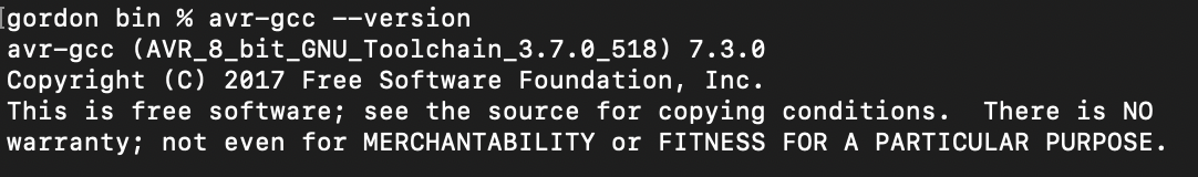 이제 터미널을 종료후 다시 실행하고 "avr-gcc"를 실행하면 다음과 같이 경고 문구가 보일 것 입니다.