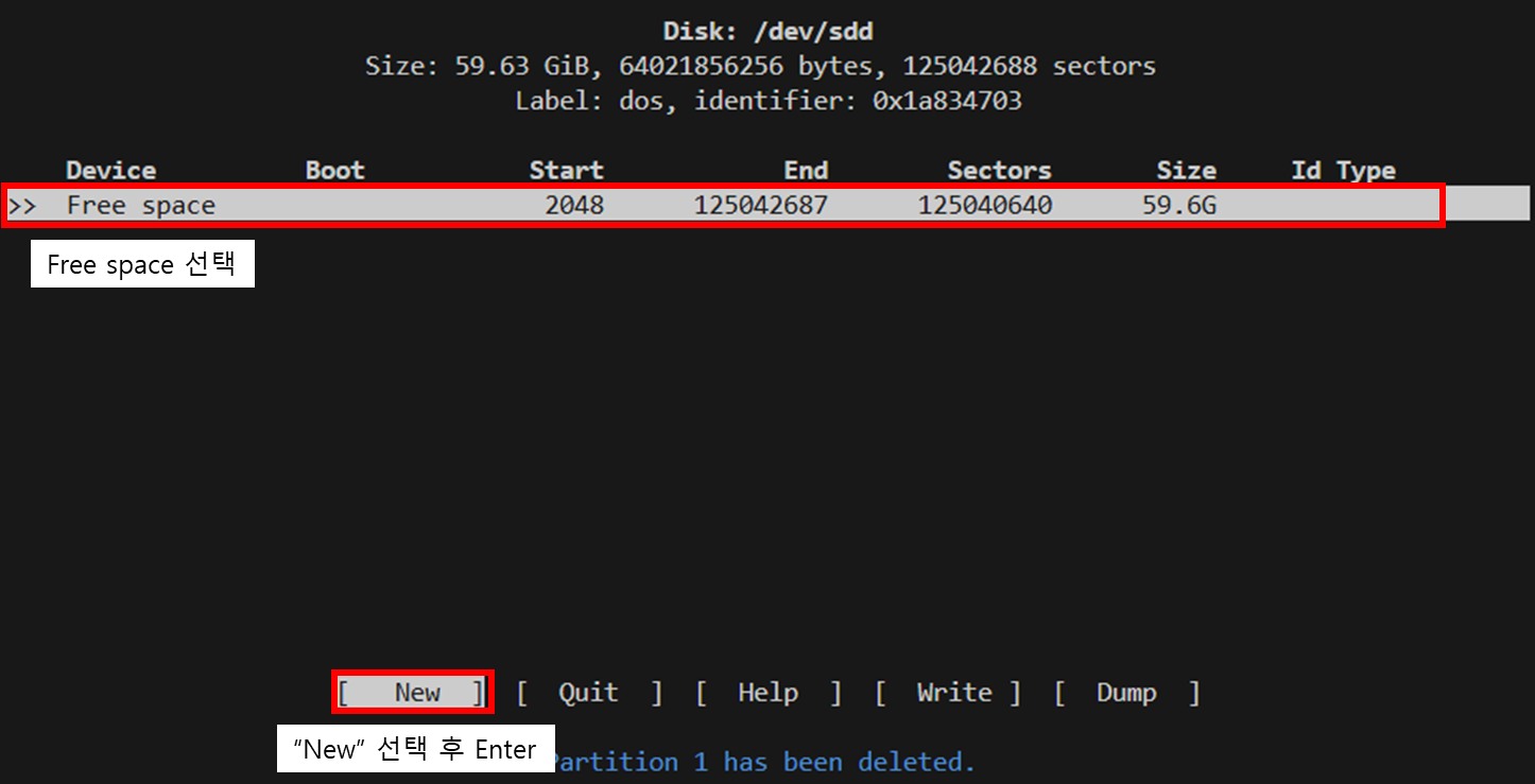 모든 파티션이 삭제 되었다면 위 사진과 같이 Device에 Free space 밖에 남지 않았을 것입니다. 이제 새로운 파티션을 생성해 주도록 합니다.