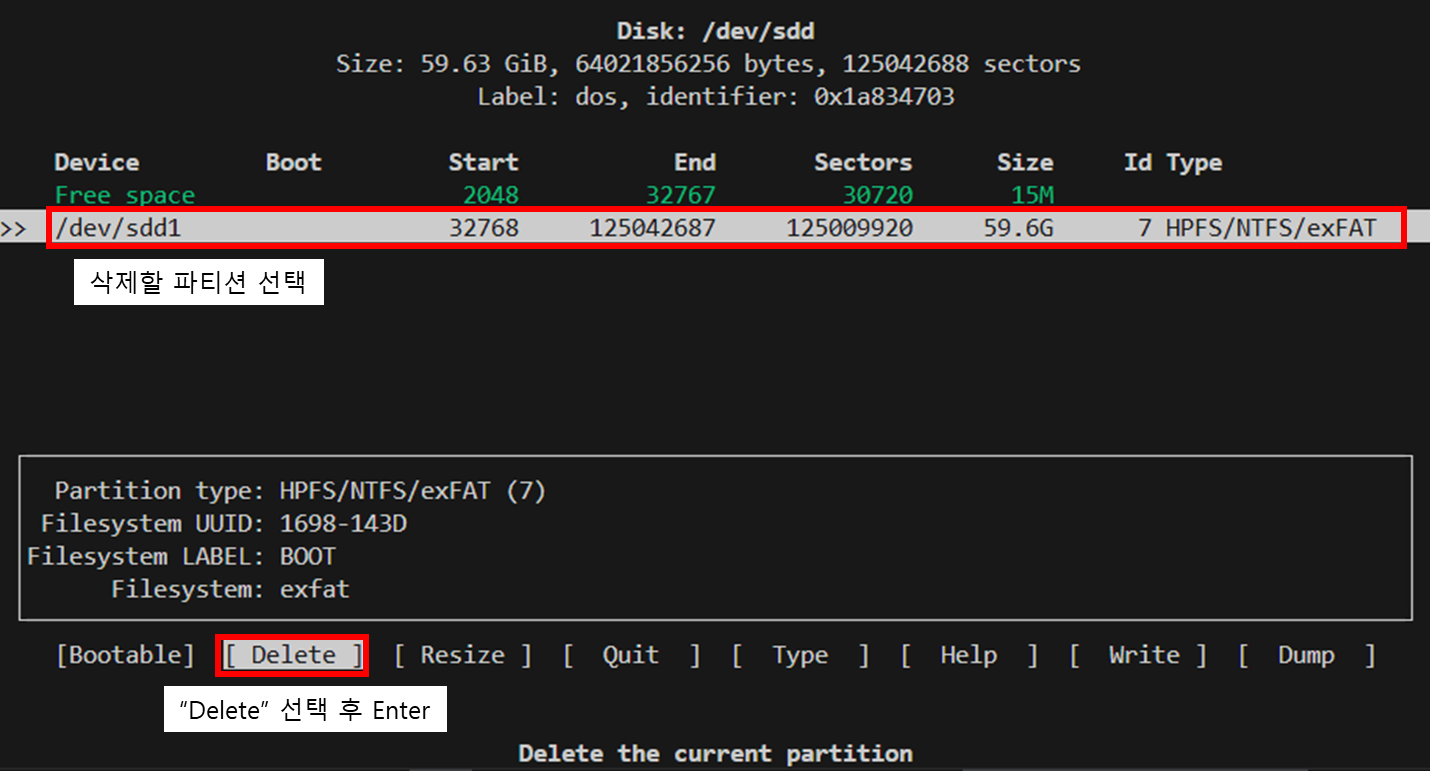 하지만, 라즈베리파이에서는 파티션의 Type이 "FAT32" 이여야 합니다. 그런데 현재 /dev/sdd1의 Type은 Linux로 설정되어 있습니다. 그러므로 Type를 FAT32 으로 변경 하도록 합니다.