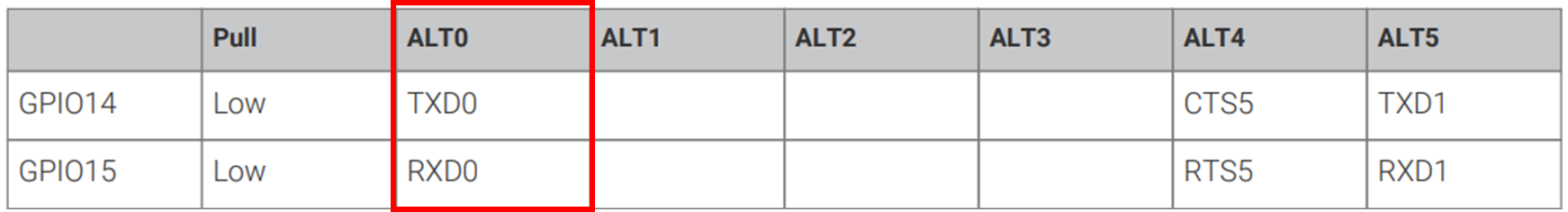 "BCM2711 ARM Peripherals"의 "Table 171. UART Assignment on the GPIO Pin map"를 확인하면 UART의 Rx,Tx으로 사용하기 위한 Pin을 어떻게 설정해야할지 언급되어 있습니다.